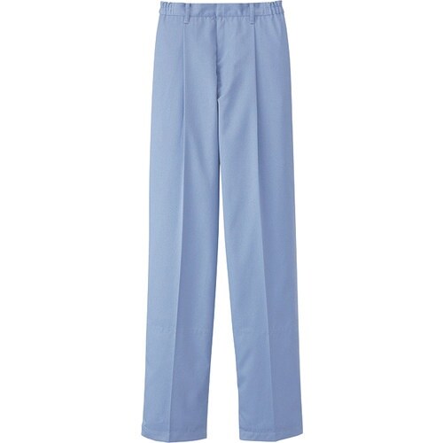 給食サービスにおすすめのストレートパンツです。ウエスト総ゴム、左脇開き金属ファスナー、右後外ポケット付きです。ホワイト、サックスの2色展開です。