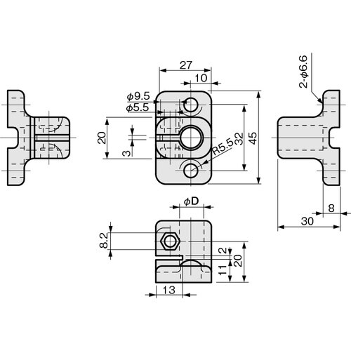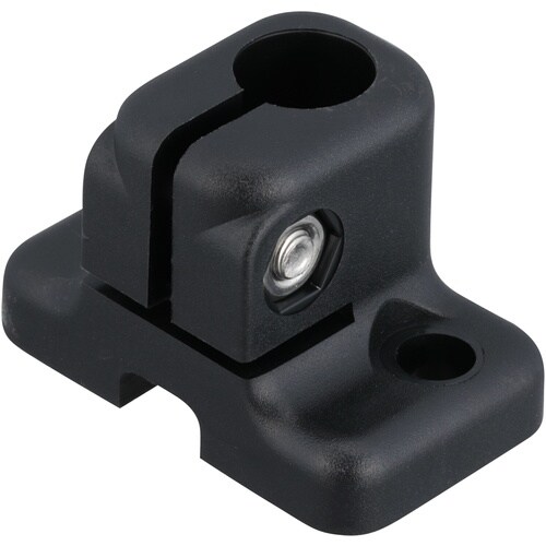 当社シャフトと組み合わせが可能な取付ベースです。樹脂成型品のため軽量で安価です。機械上面などへ取付可能です。 |
