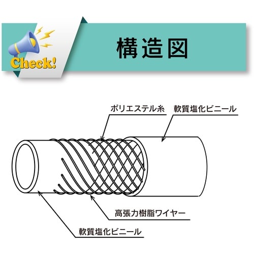 【食品対応耐圧ブレードホース】 非フタル酸系可塑剤使用し、食品・飲料・油脂食品の配管に使用可能です。【長持ち】耐油性に優れ、ホースが硬くなりにくい配合で長寿命です。 |