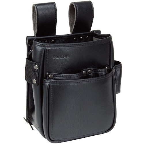 高級人造皮革製の腰袋です。厚みのある1枚ものの人造皮革を樹脂製生地で補強してます。ハーネス型安全帯対応で、吊り下げスペースを確保できる分割ベルト通し部です。 |
