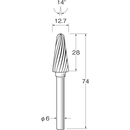 刃径(mm):12.7 | 刃長(mm):28 | 軸径(mm):6 | 全長(mm):74 | 最高使用回転数(rpm):15000 | オール超硬…