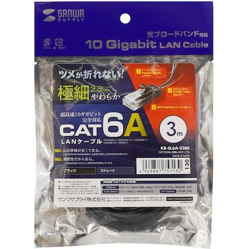 色:ブラック | カテゴリ種類:カテゴリ6A   | ケーブル径(mm):2.8 | 芯数:8芯(4P) | ケーブル長(m):3 | コネクタ形状:…