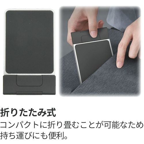 タブレット、スマートフォン対応の折り畳みスタンドです。端末との接触部分には、ゴム素材を使用しており、操作中の機材のズレを防ぎます。コンパクトに折りたたむことが可能なため、持ち運びにも便利です。 |