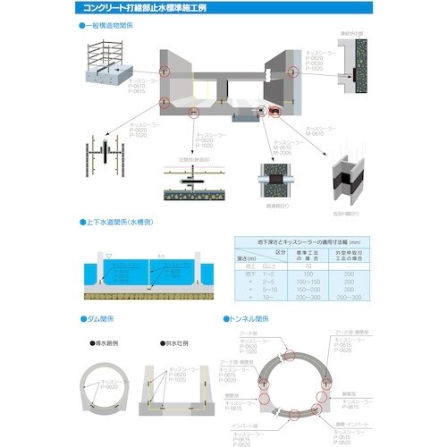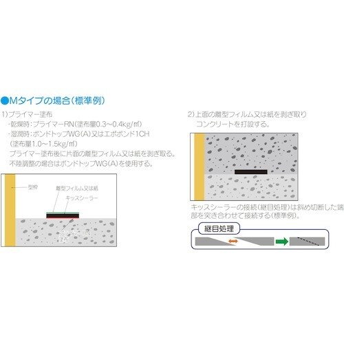 | 注意事項 | ※キッスシーラーを取り扱う場合は保護手袋を使用して下さい。離型フィルムまたは紙は生コン打設直前に剥がしてください。Mタイプの接続は原則的に隙間が出来ないよう突き合せて下さい。製品を保管する際には、直射日光の当たらない屋内で保管して下さい。積み重ねる場合には、梱包箱記載以上に積まないで下さい。 |