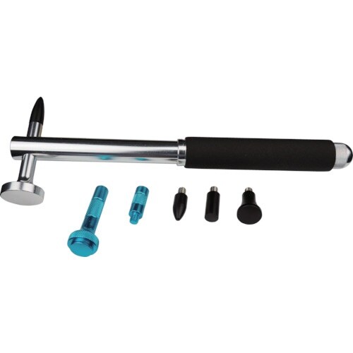 アルミ製なのでパネルが傷つきにく長時間のハンマリングでも手が疲れません。タップダウンを行う細かい作業では樹脂製の先端アタッチメントが塗装へ与えるダメージを抑えます。 |
