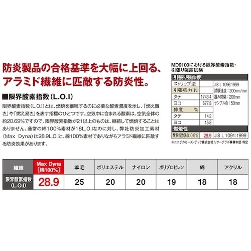信頼と実績の防炎素材Max Dynaを使用してます。限界酸素指JIS L 1091 E法(LOI値30.3)で業界トップレベルの防炎性能を有してます。溶接、溶断、火気のある現場に。