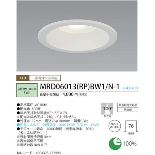 断熱材施工対応(ダウンライト)防滴形の埋込穴φ100対応です。廊下や収納スペース、間接照明などに。 |