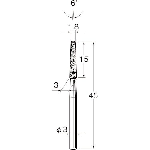 粒度(#):150 | 刃径(mm):1.8 | 刃長(mm):15 | 軸径(mm):3 | 全長(mm):45 | 最高使用回転数(rpm):87…