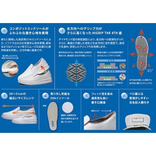 新開発の高反発EVAミッドソールにより、ソフトでふわふわな履き心地です。跳ねるようなクッション性でスムーズな足運びと疲労軽減を実現し、立ち仕事に最適です。