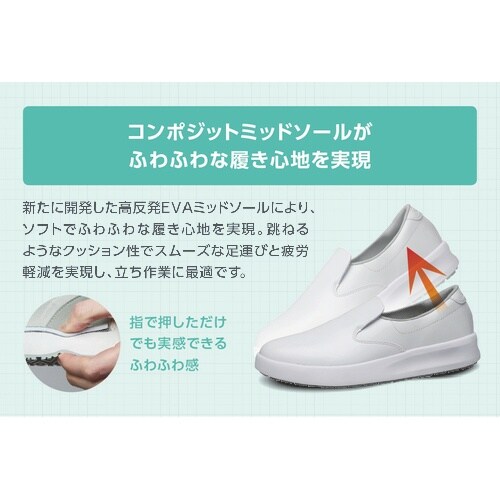 新開発の高反発EVAミッドソールにより、ソフトでふわふわな履き心地です。跳ねるようなクッション性でスムーズな足運びと疲労軽減を実現し、立ち仕事に最適です。 |