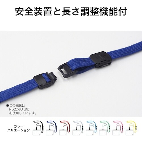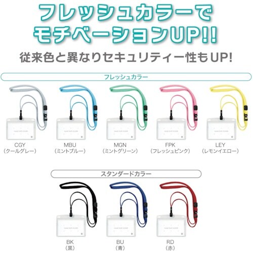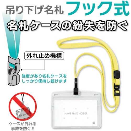 名札ケースの紛失を防ぐフック式でセキュリティー性もUPします。会社、イベント等でのご使用に最適です。差し込みクリップで胸のポケットに固定できます。 ひもには安全装置と長さ調整が付いています。