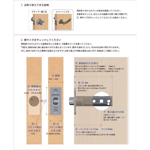今取り付けてある握り玉(円筒錠)やレバーハンドルからの取替え交換が出来る製品です。※お取替えが可能かどうかは、以下の扉寸法をご確認下さい。 |