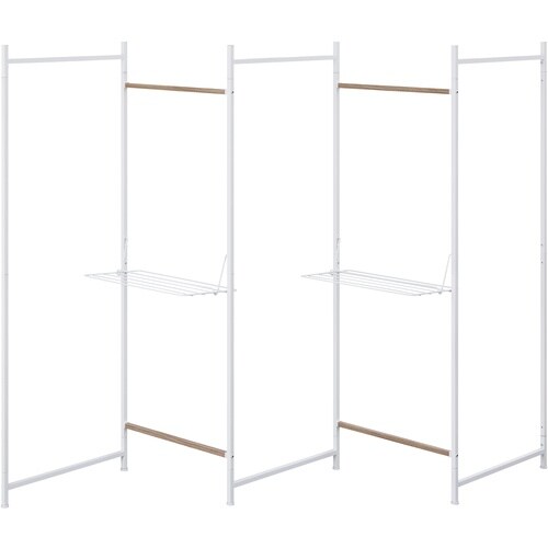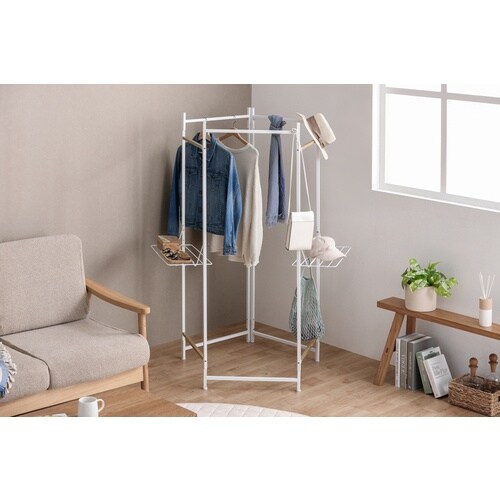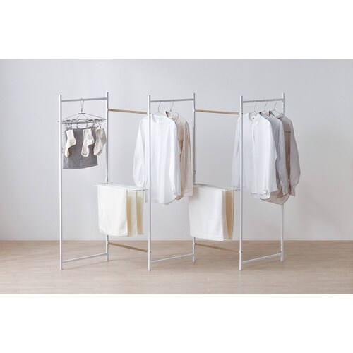 スペースに合わせて自由に形を変えられる折りたたみ物干しです。ワンピースやコートなど丈の長い衣類も干せます。タオルハンガー付きです。フェイスタオルや小物が干せます。物干しに。