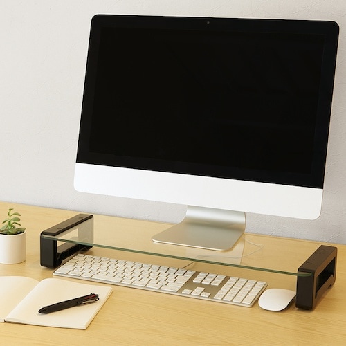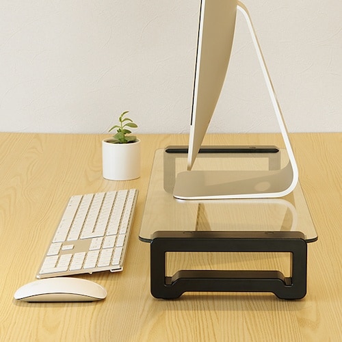 耐荷重20kgまで積載可能な強化ガラス天板を採用したモニタースタンドです。接地面に滑り止めゴムがついている為、安心してご使用いただけます。 |