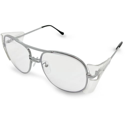 Lサイズのメタルフレームです。テンプル(耳掛け部)の曲げ伸ばし調節が可能です。飛来物、浮遊粉じん、液体飛まつなどから目を保護します。 |