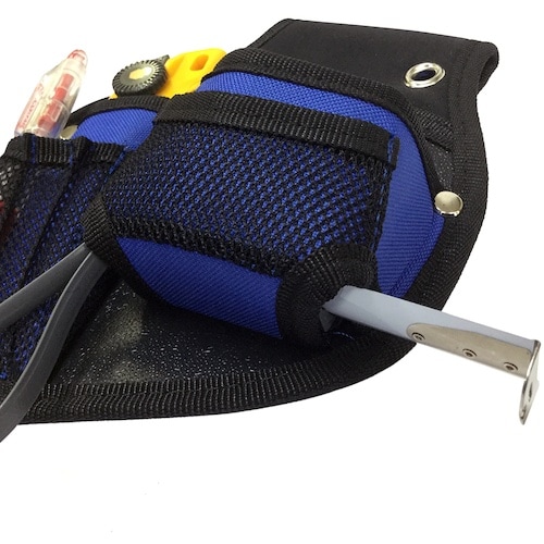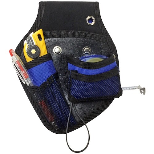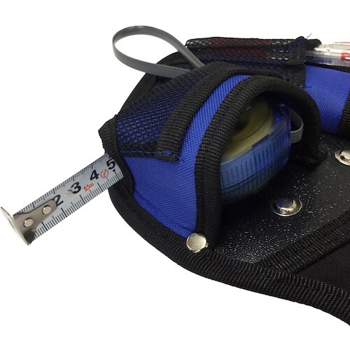 カッター1丁と2mー5.5m(テープ巾19mm)のコンベックスを収納できるポリエステル工具差しです。コンベックスは収納したままでも使用できるよう切り込みが入っています。 |