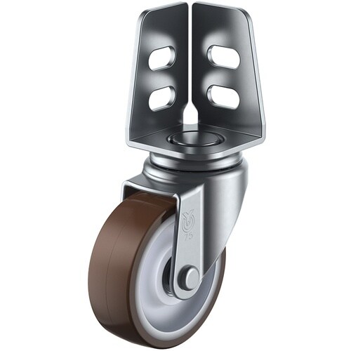 アングルへネジやボルトで簡単に取り付けることが出来ます。耐油性、耐摩耗性に優れたウレタン車輪を使用しています。アングル式の棚や軽荷重機器運搬に。