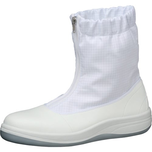 つま先にワイド樹脂先芯を搭載したクリーンルームシューズです。特殊な設計と素材を採用した靴底で、チッピングによる発塵を防ぎます。脱着が容易なファスナータイプです。洗濯することが出来ます。 |
