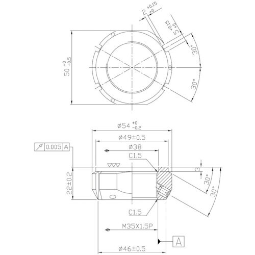 相手側60度台形ネジに対して、セットスクリューを30度で締め付けることで、ロック力が増す構造となっており、且つ3分割(120度等配)の設計となっております。ベアリングの固定用。