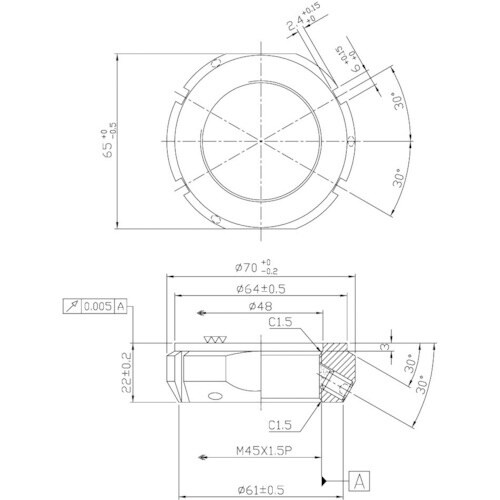 相手側60度台形ネジに対して、セットスクリューを30度で締め付けることで、ロック力が増す構造となっており、且つ3分割(120度等配)の設計となっております。ベアリングの固定用。 |