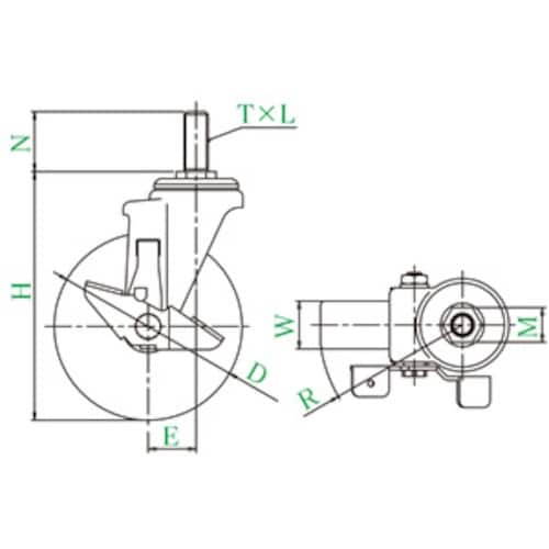 標準的な中型キャスターで重量物の運搬に数多く使用されています。ねじ込みタイプでワゴンやラックなどに適します。軽量で耐油性、耐摩耗性に優れたナイロンホイルウレタン車輪を使用しています。 |