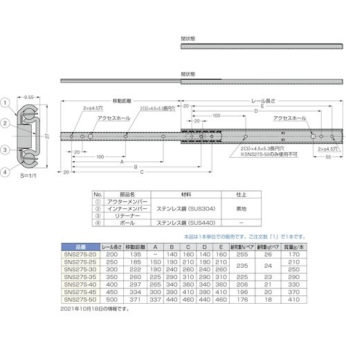 スガツネ工業 SUGATSUNE (190110182)SNS27S−45オールステンレス鋼製スライドレール A012-6248