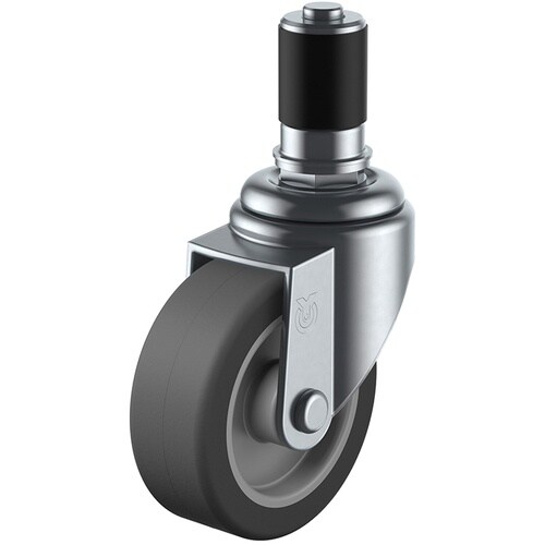走行性・耐荷重を備えた標準的な小型キャスターです。軽量で床面を汚しにくいエラストマー車輪を使用しています。軽量なパイプ組立式ラック、屋内運搬用機器ラックなどに。 |