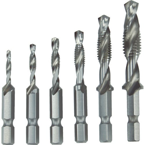 タップとドリルがこれ1本でOK(サイズ:M6)です。ドリル穴あけ、雌ネジ切り、簡易バリ取りが一連の作業で可能です。 |