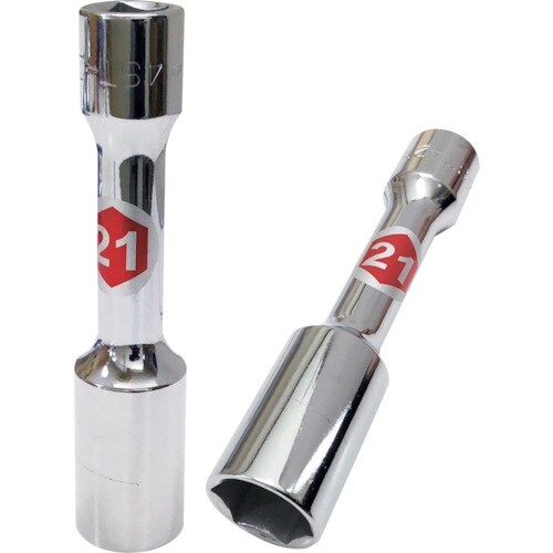 ソケット奥部に傷つけ防止用の樹脂を装着してありますので、化粧ナットを傷つけません。全長130mmの超ロングタイプなので奥まで入り込みやすく、トルクレンチ等の本体が対象物にぶつかりにくくなっています。 |