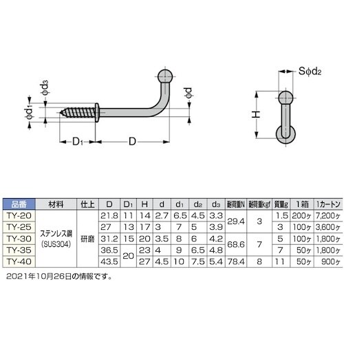 スガツネ工業 SUGATSUNE (110020050)TY−40/ステンレス鋼製玉付フック A013-1762
