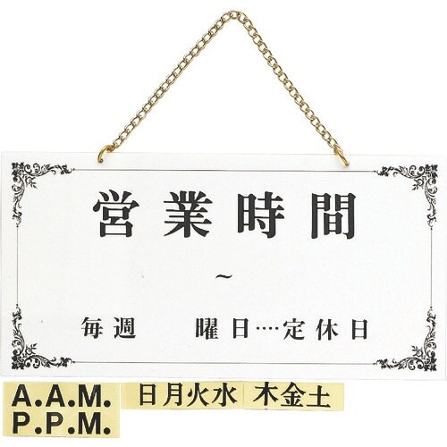 表示内容:営業時間 | 取付仕様:くさり付 | 縦(mm):200 | 横(mm):400 | 厚さ(mm):3 | 色:数字黒 プレート白 | タイ…