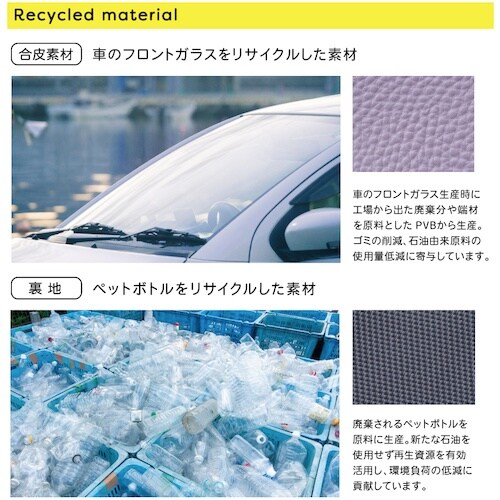 リサイクルフェイクレザーを使用した、人にも地球にもやさしいペンケースです。表地には車のフロントガラスの廃材を原料としたPVBから生産された合成皮革を使用し、ゴミ削減・石油由来原料の使用量低減に寄与。 |