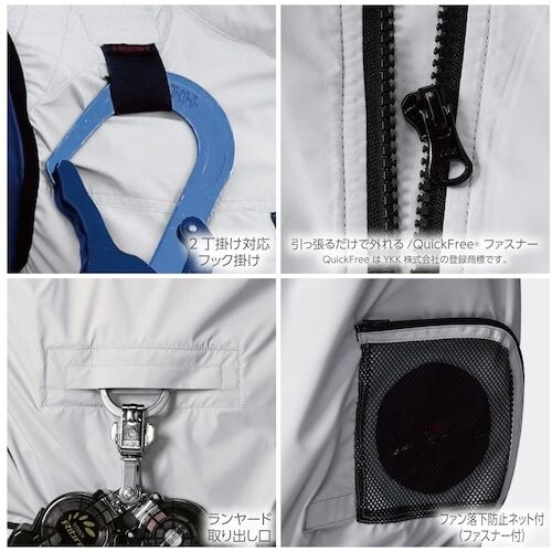 夏の作業に欠かせない空調機能を取り入れた空調ファンを取り付けれる快適ウェア。安全性にこだわったフルハーネス対応。2丁掛けフック対応のフルハーネス対応。引っ張るだけで外れるQuickFreeファスナー。