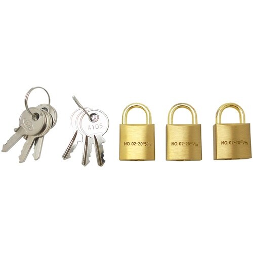 鉄鋼製の吊なので、切断に強いです。同じキーで3個のカギが開けられます。バッグなどの簡易施錠に。倉庫等の表、裏口などの管理に。