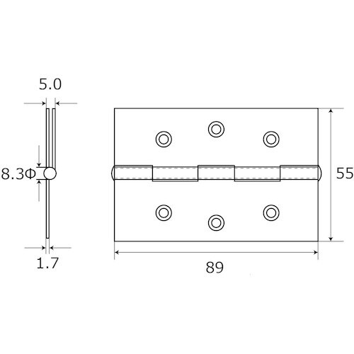 全長(mm):89 | 幅(mm):55 | 厚さ(mm):1.7 | ねじ穴数:6 | D2(mm):8.3 | 推奨扉厚(mm):30〜33 | …