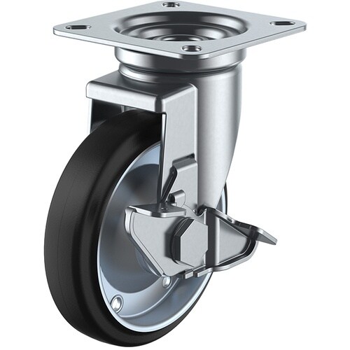 標準的な大型キャスターで、重量物の運搬に数多く使用されています。走行性に優れ、静電気を除去することができる導電性ゴム車輪を使用しています。重量物の運搬に。 |