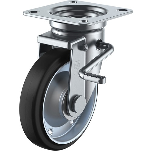 標準的な大型キャスターで、重量物の運搬に数多く使用されています。走行性に優れ、静電気を除去することができる導電性ゴム車輪を使用しています。重量物の運搬に。 |