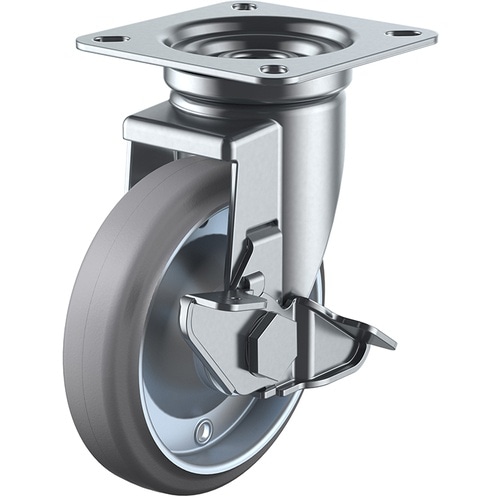 標準的な大型キャスターで、重量物の運搬に数多く使用されています。走行性に優れ、床面に走行跡を残しにくいグレーゴム車輪を使用しています。重量物の運搬に。 |