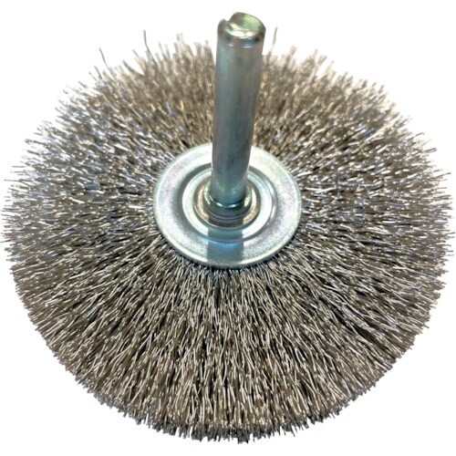 | 注意事項 | ※軸はブラシの根元まで差し込み、しっかりとチャッキングできたことを必ず確認して下さい。軍手等にフィラメント(線材)がからみ、手首ごと機械工具に巻き込まれる危険がありますので、軍手等を用いての使用はおやめください。研磨対象部品を手に持って作業すると、作業対象物がブラシの回転力に負けて飛散し、大きな事故につながります。研磨対象部品は必ず固定器具に装着のうえ、作業を行ってください。 |