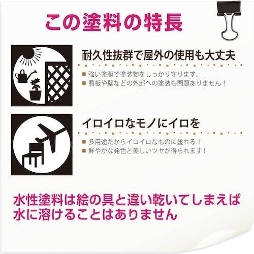 | 注意事項 | ※下記のものには塗ることができません、自動車、バイク、高級家具、床面、ビニールクロス、常に水に浸かっている所、鉄以外の金属(ステンレス、アルミ、メッキ、真ちゅう、銅、ホーロー)、タイル、化粧板、陶器、ポリカーボネート、ポリエチレン、ポリプロピレン、シリコンなど特殊処理された素材。 |