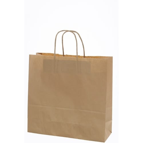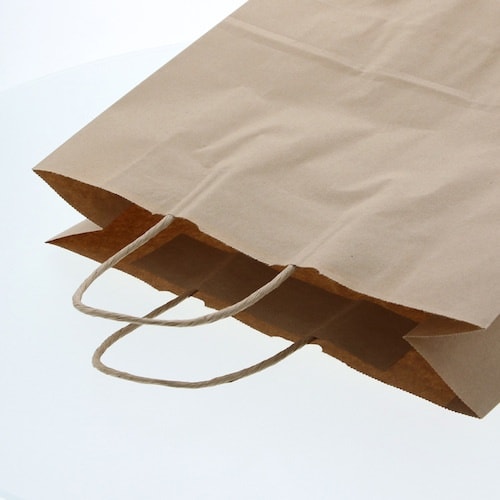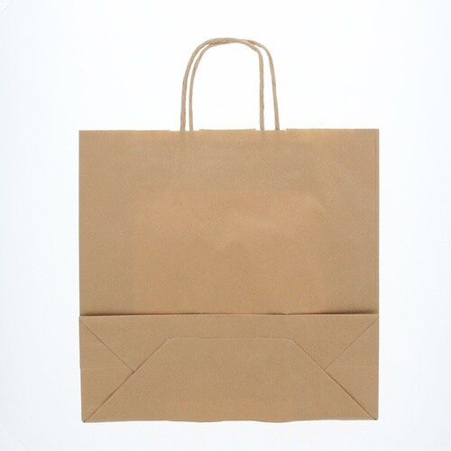 プレーンなクラフト紙の手提げ袋です。無地ものですので、さまざまな用途にご利用いただけます。廉価版のエコノミータイプ。幅と高さがほぼ正方形のオールマイティモデル。 |