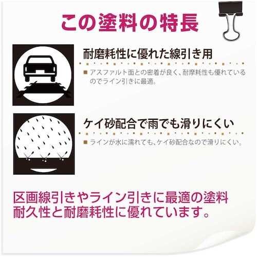 アスファルト・コンクリート面の標示や区画線引きに。ケイ砂配合だからラインが水に濡れても滑りにくい。臭いが少なく、乾燥も速く、使いやすい水性タイプ。※乾くと雨や水で流れ落ちる事はありません。 |