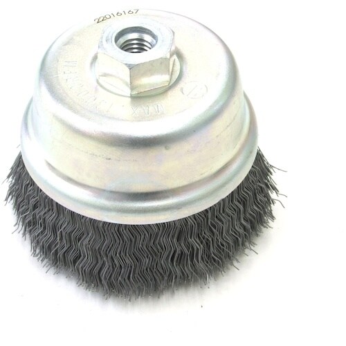 ディスクグラインダ―に取り付けて使用するブラシで、毛先が下方を向いており、平面・外角部・出っ張り部の加工に適したブラシです。 |