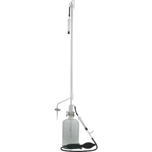自動ビュレットは、ビュレットに比べ薬液の補充が2連球ゴムスプレーの操作で安全かつ正確に行えます。ゼロ(目盛)が自動的に調整できる構造となっており、ビュレットのゼロ合わせのコック操作の必要がありません。 |