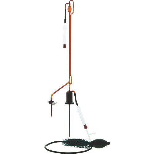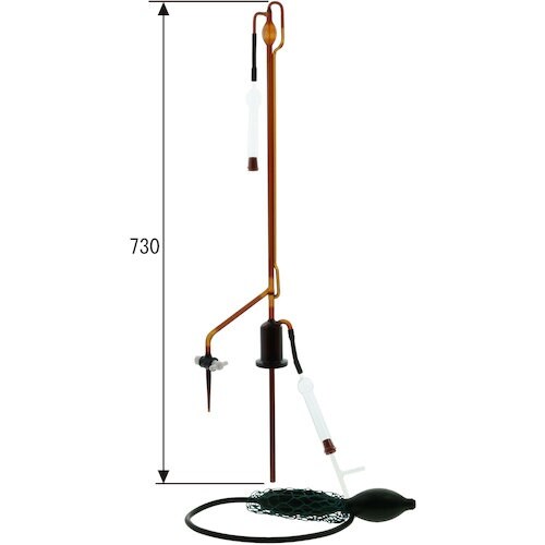 自動ビュレットは、ビュレットに比べ薬液の補充が2連球ゴムスプレーの操作で安全かつ正確に行えます。ゼロ(目盛)が自動的に調整できる構造となっており、ビュレットのゼロ合わせのコック操作の必要がありません。 |