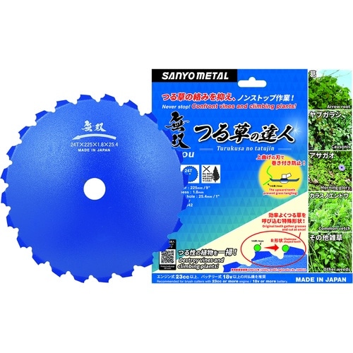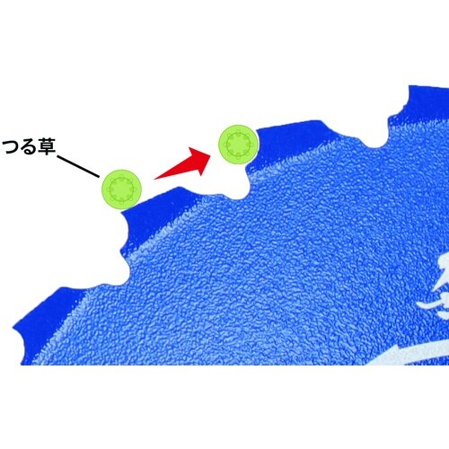上曲げの刃でギアケースへの巻き付きを防止し、つる草を呼び込む特殊刃型と特殊R形状刃で効率よくつる草を切断可能です。つる草が絡まない刃形状で効率的な作業が可能です。刈払機でのつる草及び雑草の処理に。 |