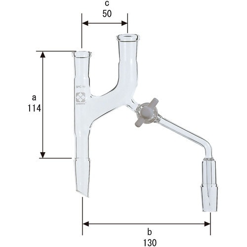 分留と還流をさせる割合をPTFEコックと毛細管構造によって流下させる流量を微調節できる分留頭です。上部には、同じSPC規格の温度計を装着可能な二重構造になっています。 |