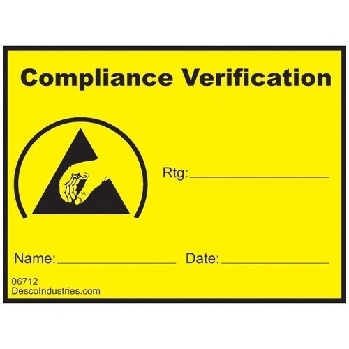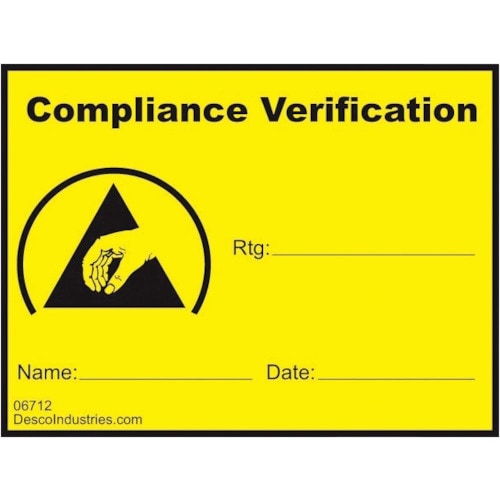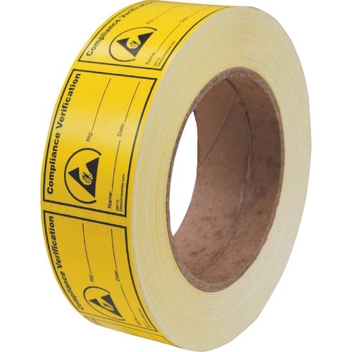このラベルの貼ってあるアイテムは、試験されていてESDコントロール計画の一部として使用されていることがわかります。ラベルは無傷のままで剥がれないので、一度きりの使用に。静電対策している注意喚起に。 |