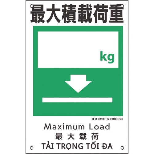 日本緑十字社 緑十字 建災防統一安全標識 最大積載荷重○○kg KS9 450×300mm ポリプロピレン A013-9001