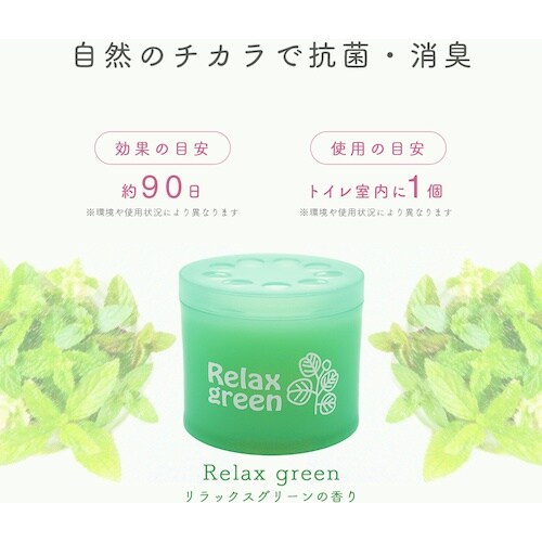 90日間効果のあるトイレの消臭剤です。トイレの壁や床などに飛び散った尿汚れなどを抗菌・消臭してくれます。リラックスグリーンの香りです。 |
